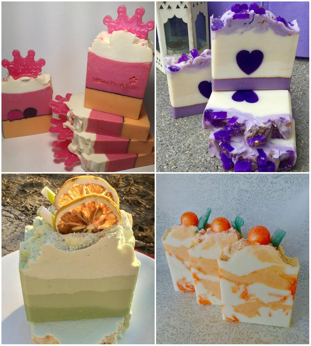 From top left, clockwise: Pink Sugar Secret Soap, purple soap with heart embedsExtra Bubbly Margarita & Cracked Pink Sea Salt Soap, Orange Sorbet Cold Process Soap