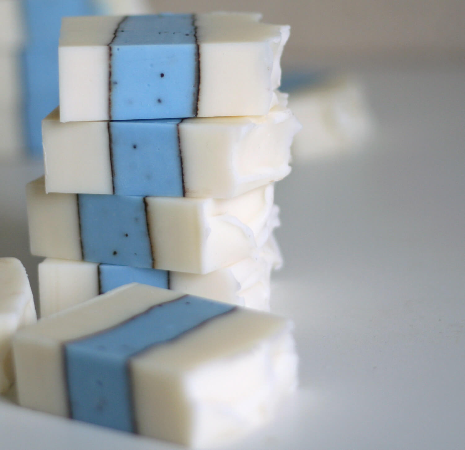 Below are some of Mango Fleur’s gorgeous cold process soaps. I love the playful use of embeds and masterful application of color. Embeds add so much personality to soapy projects! If you’re looking for more embed inspiration, check out the Emerald Swirl Cold Process Tutorial. This project uses melt and pour to accent the top of each bar. If you’d rather use cold process, the Neon Embed Cold Process Project will be right up your alley.