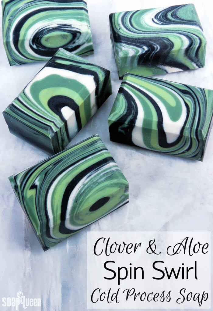 The Spring Fever Kit also features Clover and Aloe Fragrance Oil, which is fresh and crisp. It also performs beautifully in cold process soap, which makes it a great choice for the Clover and Aloe Spin Swirl Soap. The swirl is created by pouring soap in layers and spinning the mold to create interest. Soaping with a very thin trace is key for this technique. For a springy color palette, the soap has green, white and black hues.