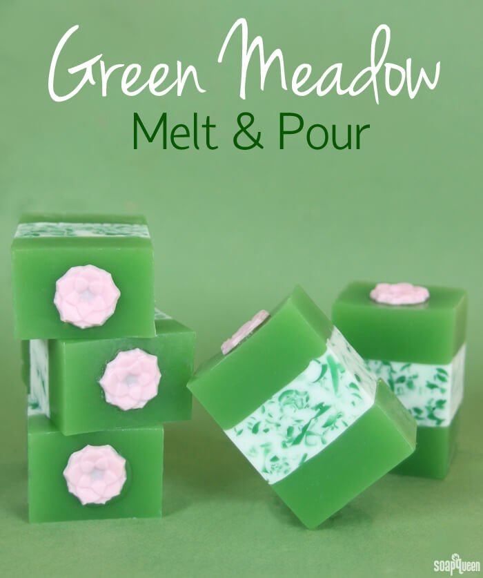 Green Chrome Oxide and Grass Stain Fragrance Oil add a bright color and fresh scent to the Green Meadow Melt and Pour Tutorial. The middle layer uses grated soap to create a confetti look, which adds interest to the solid green layers. A pink flower on top adds contrast and a feminine touch.