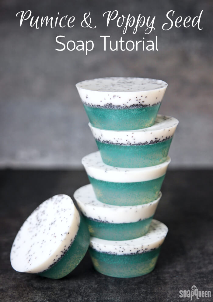The masculine projects continued this week with the Pumice and Poppy Seed Melt and Pour Tutorial. They bars are made with pumice, poppy seeds and Lagoon Green Jojoba Beads to help scrub away dead skin. The exfoliants also add color and interest to the soap. For a masculine scent, the soap is scented with Bramble Berry’s Made to Measure Type Fragrance Oil.