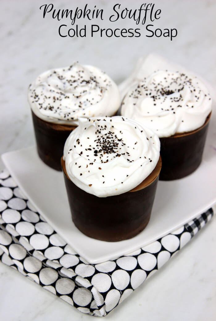 Pumpkin Souffle Fragrance Oil is another scent in the collection. It has notes of pumpkin, baked goods, espresso and pecan. It’s used in the Pumpkin Souffle Cold Process Soaps, which are made in disposable cups and topped with fluffy white soap and used coffee grounds. They’re a perfect gift for someone with a sweet tooth.
