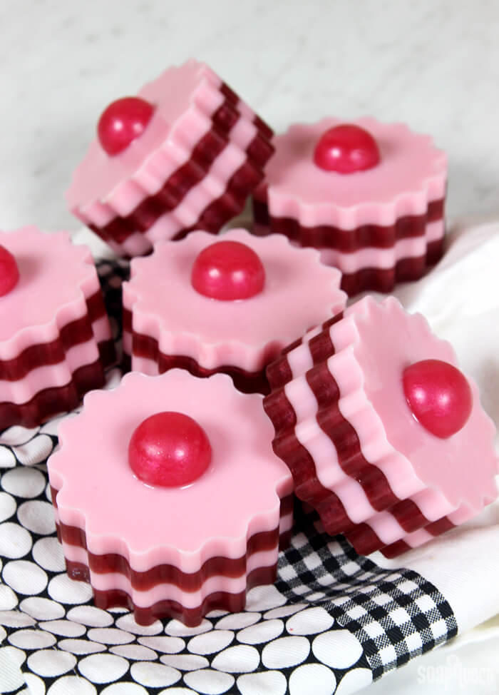 This week the blog featured several tutorials using the new Seasonal Sweets Fragrance Collection. It has four dessert-inspired scents perfect for the holidays, including Red Berry Rhubarb Fragrance Oil. That scent inspired the Red Berry Melt and Pour Soap Tarts, which have cute red and pink layers and an embed on top.