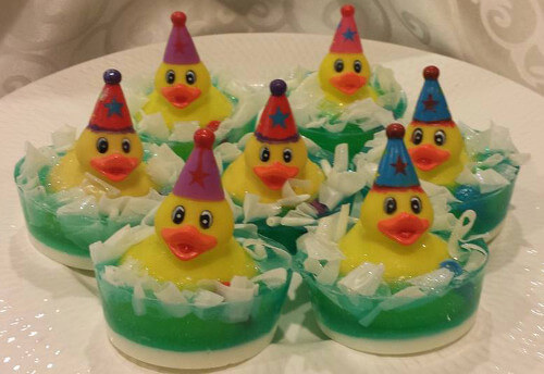 The melt and pour soaps feature green and white layers, soap scraps and of course, adorable rubber duckies. If you’d like to add some cute ducks to your soap, click through the Easter Ducky Soap Tutorial. You can also embed the ducks, as seen in the Embedded Ducky Soap Tutorial.