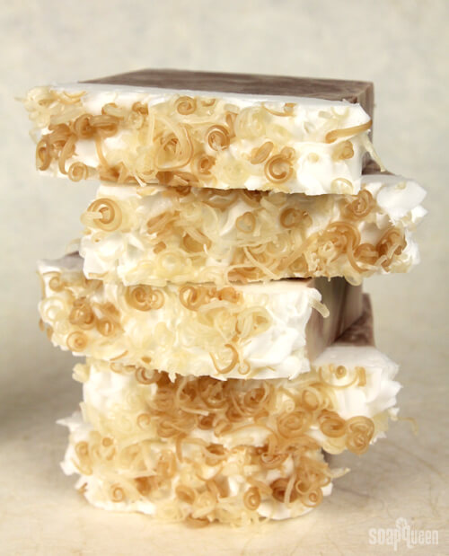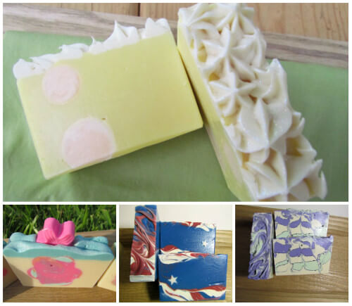 Shown above (top, clockwise) is Cathy’s beautiful Lemon Soda Cold Process Soap, Mangosteen Cold Process Soap, Stars and Stripes Cold Process Soap, and the Sarbear Cold Process Soap. Severa; of these soaps features embeds to give extra color, personality and flair. If you’d like to try working with embeds, check out the Crisp Anjou Pear Embed Tutorial. If you prefer melt and pour, the adorable Rainbow Hearts Melt and Pour Tutorial features embeds along with plenty of color.