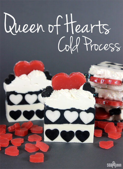 The Queen of Hearts Cold Process Soap uses medium trace to support adorable black and white melt and pour heart embeds. It also uses thick trace cold process frosting to great a fluffy white top decorated with red and black hearts. Scented with LoveSpell and Baby Rose fragrance oils and topped with sparkly iridescent glitter, this soap will make a perfect Valentine’s Day gift.
