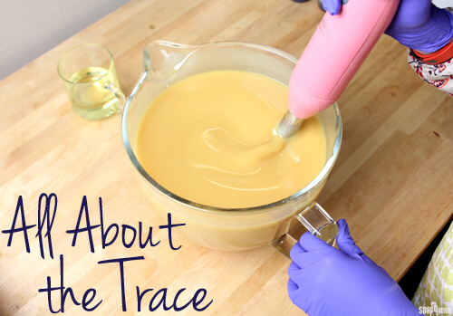 For more soapy tricks and information, check out the All About the Trace post (talk about an earworm!). Trace is the point in the soap making process when oils and lye water have emulsified. Various factors such as temperature, recipe and stirring method can affect trace; click through to learn more and see examples of thin, medium and thick trace.