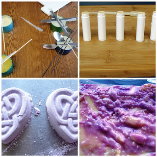 1. 4 test candles with different waxes, 2. Testing new lip flavor, 3. Bath Fizzies, 4. Seizing Soap! Oh no!