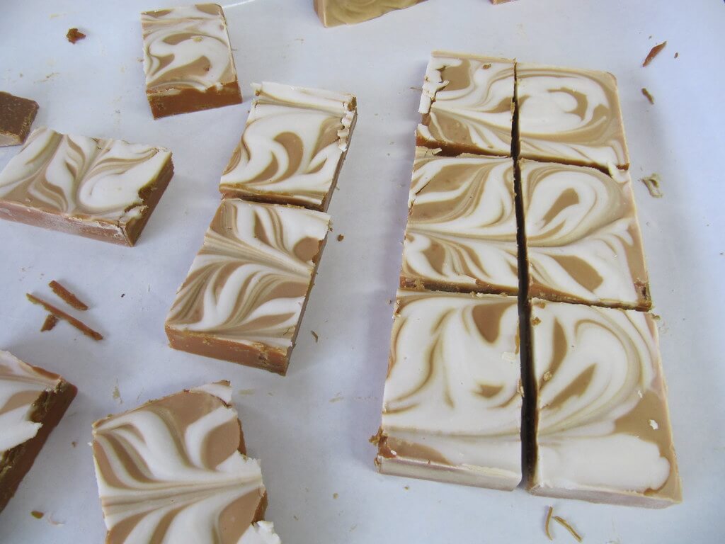 We designed a jam packed two days for Selena. Cold Process soap – swirled with the Bramble Berry ‘World’s Best Divider Molds’ and a couple double layer loaves (with a sprinkled mica vein in the middle of each layer, above). The above soap is the dark color because of the honey. It gets hot and burns in the soap, causing it to turn brown.