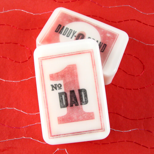 I was so inspired by Martha’s Craft of the Day. I printed out her retro Father’s Day clip-art labels on water soluble paper and embedded them in melt and pour soap for these super cute and custom Daddy-O-Soaps! Check out Martha’s clip art here and learn how to embed water soluble paper in soap here.