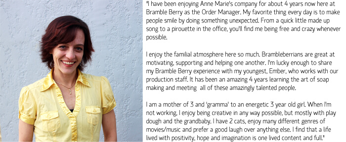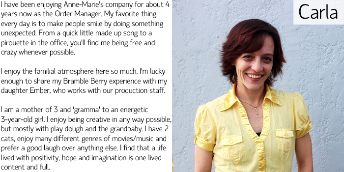 If you have ever called, emailed, chatted or Facebook’d Bramble Berry, you have talked with one of these gals below. In addition to their soaping and crafting knowledge, each member of the team brings unique talents and strengths to the workplace each day. Read a little bit more about the office team below, including their favorite fragrance oils and Soap Queen blog projects.