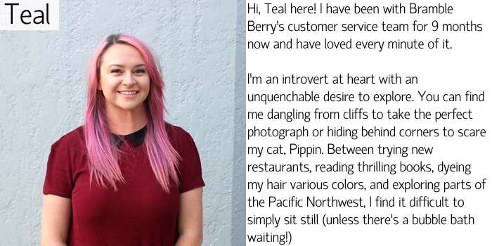 Teal is awesome she has helped me many times with my dumb questions and is always patient and has kindness in her voice, and i love that her name is Teal, seriously cool parents! seeing her hair is pink cracked me up cuz i for some weird reason had a image in my head that her hair was crazy colored, which just makes her even more cool! thanks for always helping me out Teal! and to everyone else at Brambleberry you give a small family owned feel to a big business! please keep it that way! ive tried in the past to order from some other places just to check them out, (WSP) they literally take FOREVER to even get things shipped, and then im like oh theres my stuff almost a month later!! So after testing out various places in the past 2 years, i have made the decision to stick to BRAMBLEBERRY no matter what! if you dont sell that particular oil or ingredient than i simply wont use it! i keep everything from colorants, soap, bases, fragrances, etc with you guys only, i always know im getting everything within a certain time frame, and if your out of stock on something you always have it on the website so i know not to order at that time and when to come back, i cant tell you how many times i have ordered something somewhere else and find out weeks later that they were out of that and not only did i not get my stuff but then i had to wait forever for a refund, i also love that you put a little bottle of frag oil, ive gotten hooked on so many because of this and i appreciate you letting me try something out first like when you have the option to request what your sample will be, thats very kind! SIDE NOTE: unfortunatley i have had to order sweetened lip balm flavors from another site, which was a nightmare and took forever and once i run out i refuse to ever buy from them again so im hoping you guys are working on getting a bigger variety of lip balms flavors that are already sweetened or even just more that arent sweetened, ive been looking everywhere for a good mocha flavor oil or having holiday themed flavor oils like pumpkin pie or apple etc Also ive been looking for brighter bath bomb colorant options, ive bought pretty much every kind of labomb you have and they are colorful but not as bright as i hoped like the teal if i dont want it pastel it gets really dark, or your pink last year seemed more bright when i used it now it kind fades out not so much of a hot pink like it used to be when i compare old bath bombs verses new ones, id also like to see a really true purple or true red because the adobe is well, adobe lol, i looooooove your cantaloupe its a perfect orange! and your daisy yellow is perfect! should i just try using micas? i did it once and it seemed like i had to use a ton of mica to get it to not be pastel, then the tub had a ring of mica around it which worried me for customers so i threw them all away lol i didnt want to stain a tub and get a bad review! also if you guys ever have a fragrance oil testing panel in which i could make soaps with scents i would love to be part of a panel or even an event of some sort. check me out at http://www.ravenscreeknaturalco.com on instagram @ravenscreeknaturalco or facebook.com/ravenscreeknaturalco or my wholesale site ravenscreekwholesale.com im a wholesale and private label company we make up to 6,000 products a month privately and we sell the overstock “left overs” fresh on etsy or our site! thanks guys!