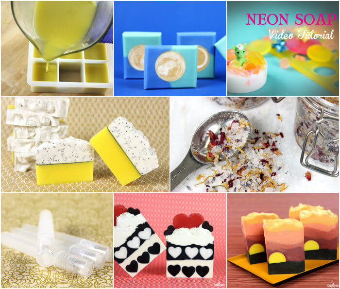 Top row, left to right: Olive Oil + Castile Soap Tutorial, Misty Maritime Moon Cold Process, Neon Ambrosia Soap