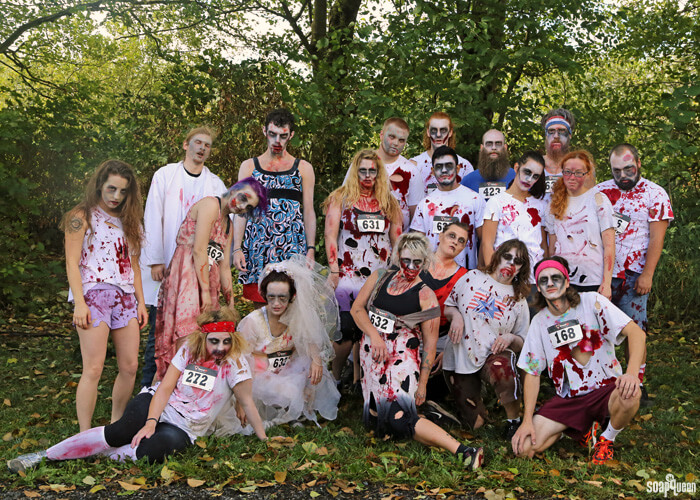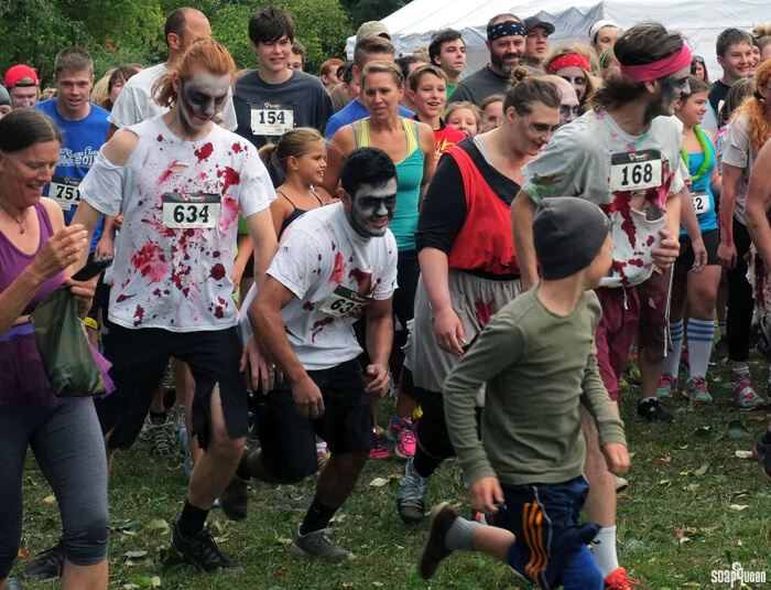 Last Saturday, the Bramble Berry team participated in the 2015 Muds to Suds race. This 5K race includes more thanĀ 25 obstacles including mud pits, climbing walls and hurdles. Each year also includes a team costume contest. This year the team really brought it! The costume theme was “The Washing Dead,” and each Bramble Berry racer dressed up in full zombie makeup and attire (made, naturally, from Bramble Berry products like zinc oxide, Labcolors, titanium dioxide and charcoal) .Ā Extreme winds cut the race short (literally, the race was evacuated due to high winds that knocked down trees). Luckily the entire Bramble Berry team got to run before the event was cancelled. Check out photos from the 2013 Muds to Suds event here.