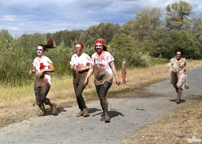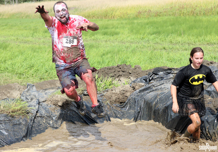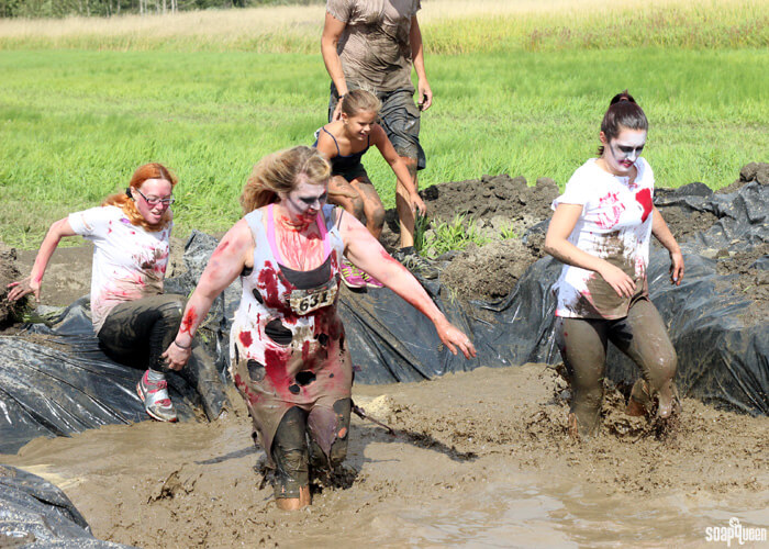 Many of the obstacles included pits of mud and cold water. Below, Emily, Nikki and Bentli make their way through one of the ice-cold mud pits. In the photo far below, Carla runs through the pit wearing her awesome zombie bride costume.