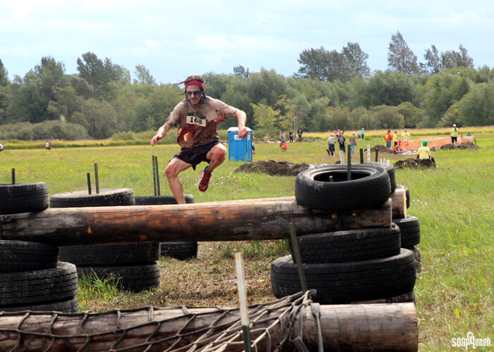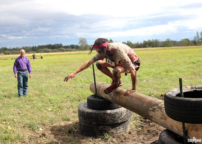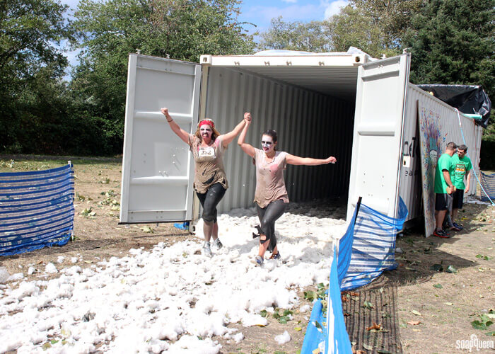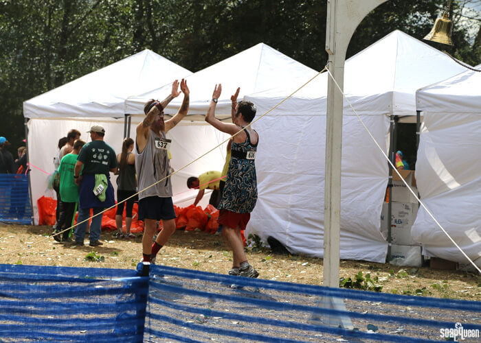 Above, George shows off his amazing jumping skills as he leaps over the obstacles. George was the first person in the Bramble Berry team to cross the finish line, and it’s easy to see why! Below, Lindsey and Bentli show their team spirit as they make their way through the bubbly finish line.