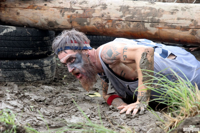 Below, Mike and Carla leap into a mud pit with abandon! The zombie costumes really inspired the crew to give it their all for the camera.