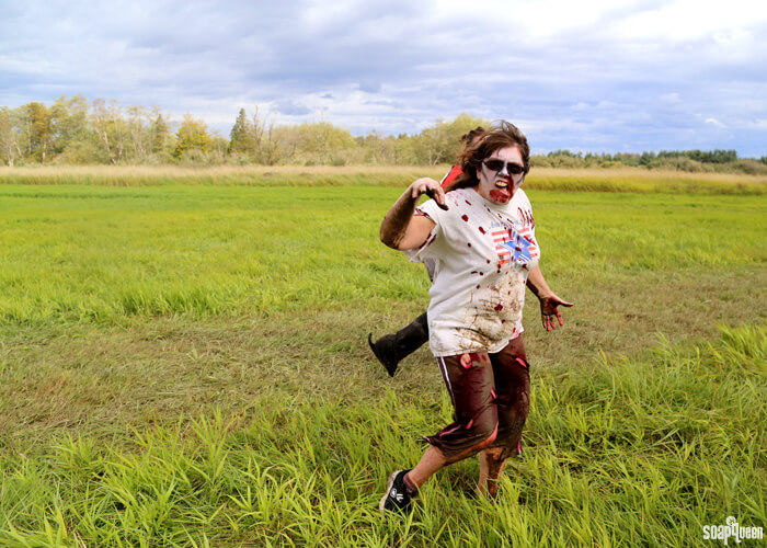 Lara, who works in production, stays in zombie character while running through the leaves.