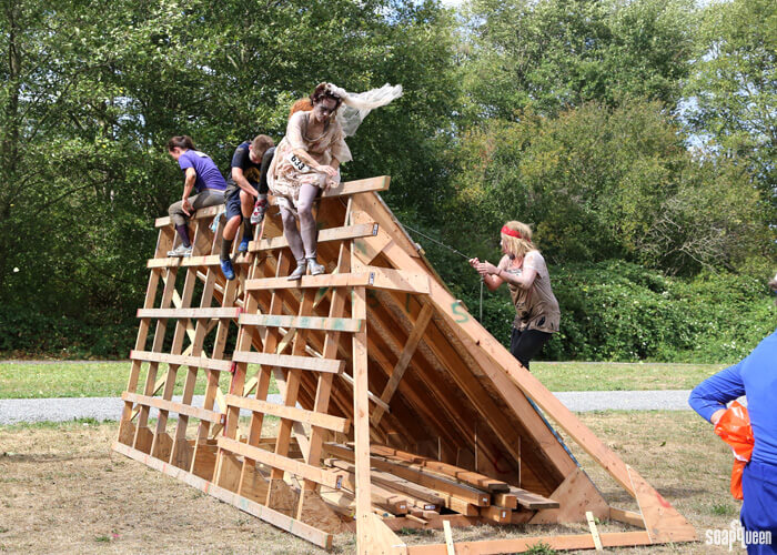 Tina (above), an expert packer, gives the camera her best zombie face while running through the race. Below, Carla and Lindsey make their away over a climbing wall. You can see from Carla’s veil just how windy it had gotten by that point.