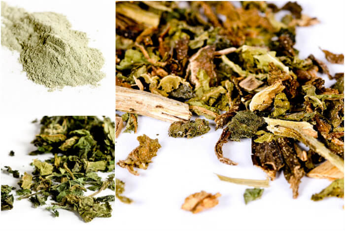 Top left, clockwise: French green clay, comfrey leaf, nettle leaf