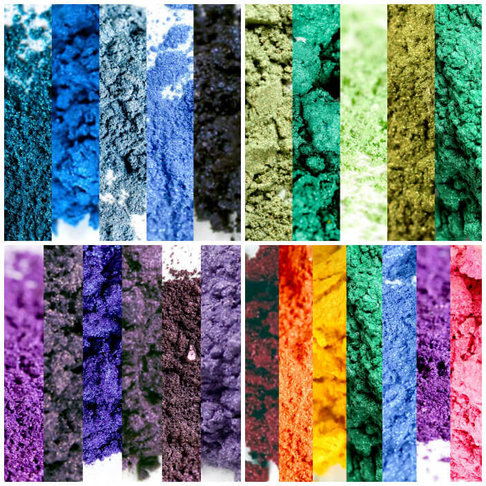 Top left, clockwise: Blue Mica Sampler Pack, Green Mica Sampler Pack, Purple Mica Sampler Pack, Rainbow Mica Sampler Pack