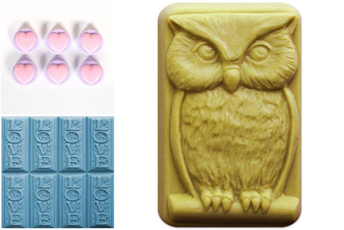 Top left, clockwise: Guest Mini Heart Mold, Owl Soap Mold, Love with Flowers Tray Mold