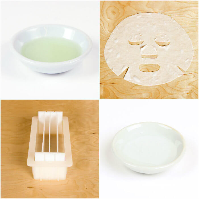Top left, clockwise: Beard Oil Base, Facial Treatment Masks, Propylene Glycol, Multi-Pour Tool for 10″ Silicone Mold