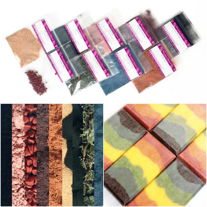 The Natural Colorant Sampler Pack includes nine natural colorants that can be used to make the rainbow soap shown on the right.