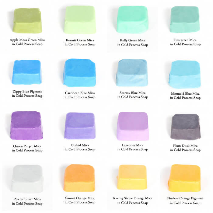 On the other end of the spectrum, 16 new micas were added in December. In particular, we focused on shades of green, blue, purple and orange. It was incredibly important that these colorants all work well in cold process soap, as micas have a tendency to morph in the harsh pH environment. Check out the shades in cold process below. If you’d like to see them in melt and pour, click here.