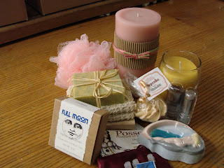 Among the loot is a Sweet Pea candle (the pink one in the back) from Full Moon Candles, two of the Choco Balm Experimental Lip Balms and a Banana Nut Bread Beeswax candle and more!