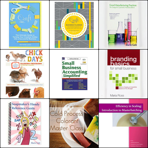 Bottom Row: Soapmaker’s Handy Reference Guide, E-Book Cold Process Colorant Master Class, E-Book Efficiency in Scaling