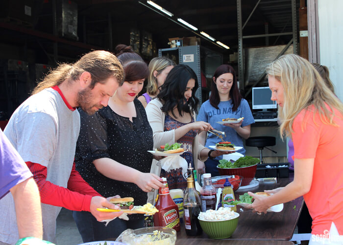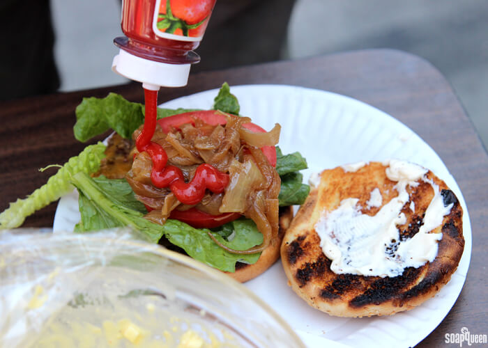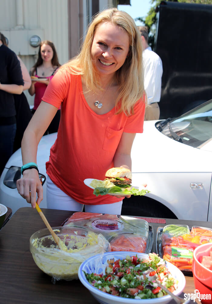 We love summer because it means we can all eat outside at work AND fire up the BBQ. Bramble Berry supplies the burgers, veggie patties and hot dogs and everybody brings a side dish. It’s a great way to not only enjoy the sun, but hang out in a more relaxed setting than the warehouse (where it is run, run, run!). I like to bring something that I hope is crowd-pleasing and generally healthy. Last year, I made kale salad with ingredients fresh from my garden. This year, I made a paleo egg salad. I decided to go the extra step and make my own mayonnaise for this salad. I think it’s definitely worth the extra work, but store bought mayo works just fine too. =) Below (left to right) Neil, Kelsey, Mariam, Lindsey, Bentli and I dig in!