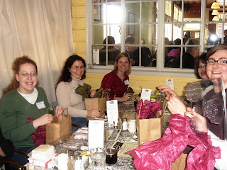 It was enlightening to listen to everyone’s take on their soap businesses. We had two full time soapers (Robin and Liz W) and many part-time crafters. Here’s a photo of part the group opening their Bramble Berry Schwag Bags with complete with Milky Way Soap Molds, 3-D Soap molds and ropes, Bramble Berry fragrances, Jojoba Beads, the new Bulk melt and pour and a soap rope.