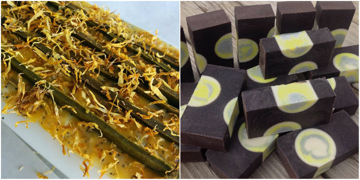 Below on the right, you can see the final cut of Sweet Revenge Soapery’s Indigo-Annatto Negative Space Funnel Pour. They turned out great! This technique is a two-part process that involves filling negative space with soap. If you’d like to see this process in action, check out the Misty Maritime Moon Cold Process Tutorial. Below on the left is the Annatto and Yarrow Cold Process project made by Amy Warden of Great Cakes Soapworks. It’s one of my favorite projects from the book, so I can’t wait to see her bars cut.