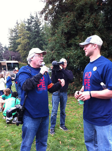 One of Kyle’s strongest supporters during his fight was Husky Quarterback Jake Locker. Jake did so much behind the scenes, coming over to play video games with Kyle, helping with fund raising and publicizing Kyle’s plight to help defray medical expenses. And, he hasn’t quit helping. Despite getting home at 3 a.m. yesterday morning from the Husky’s incredible win over the LA Trojans, he showed up bright and early to sign autographs, t-shirts and babies (yes, he signed babies; it was the cutest thing). An additional cool factor to his presence was that ESPN is covering his every move, in anticipation of the NFL draft. There was speculation that had he gone pro last year, Jake would have been the No. 1 draft so ESPN has a camera following him everywhere in preparation for this year’s draft.