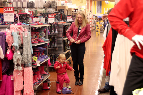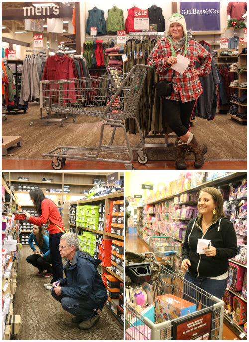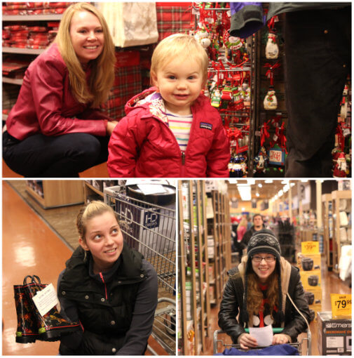 Below, Lily and I peruse the Christmas aisle to grab wrapping paper. On the left, Natasha, picks up a pair of adorable rain boots. On the right, Emily strolls through the kitchen department to cross items off her list.