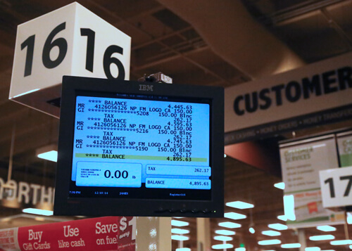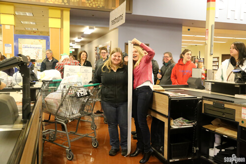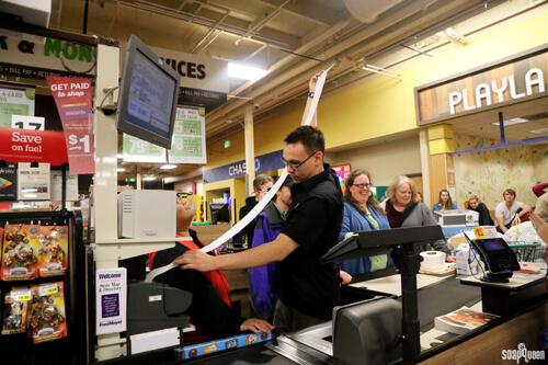 The final receipt was huge, over five feet long! Below, our awesome cashier prints the receipt. As you can see, the receipt was taller than Caitlin in production, and almost taller than me!