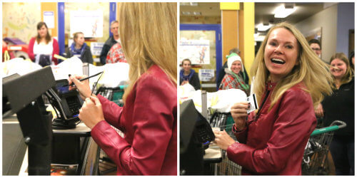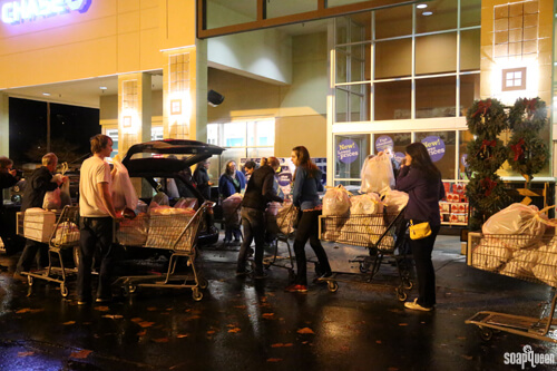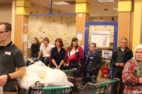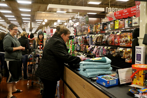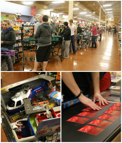 Take a look at that line of Brambleberrians! Luckily, Fred Meyer’s was prepared for us, and devoted a register at the end of the store for our transaction. Below on the left, is a cart filled to the brim with toys and clothes. On the right, gift cards are loaded up to provide families money for groceries.