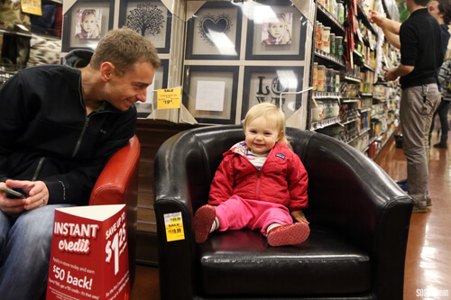 Lily and Chris take a little break from shopping in the home furnishings department. Such a smiley little girl =) Jamisen stayed in the play area of the store during the shopping trip; he had never spent time in the daycare area and had a blast playing with all the new toys. He was soooooo sad when it was time to leave.