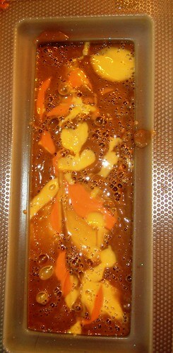 I spent Sunday soaping. Batch one was a Cold Process batch made with Cappuccino Mica (the brown colored soap in the photo) and non-colored soap (the ivory). I used a vegetable peeler to peel little curls off of pre-made melt and pour soap. The green swirls are colored with Emerald Green LabColor and the yellow swirls are Canary LabColor. I’m interested to see if the colors migrate into the cold process soap soap.