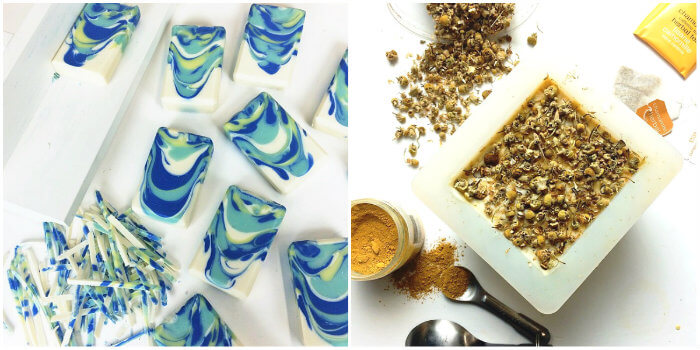 This past week has been full of colorful projects for a fun promotion starting in February. Below on the left, is a cold process soap made with Ultramarine Blue Pigment and Ocean Rain Fragrance Oil. On the right, is a chamomile soap made with Yellow Oxide and Chamomile Bergamot Fragrance Oil. I can’t wait to share these tutorials with you!