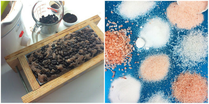 Have you tried hot process soap before? On the left is a hot process project scented with the yummy Espresso Fragrance Oil. On the right are some of the salts that you can use in your bath and beauty projects. Click here to learn more about salt.