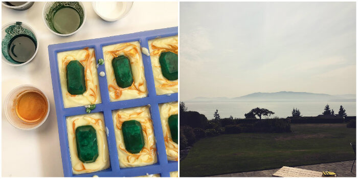 On the left is a cold process soap with emerald melt and pour embeds. It’s scented with Green Fig Fragrance Oil and smells so fresh! On the right is Bellingham Bay, covered in smoke from the wildfires in Eastern Washington. Please rain, keep coming!