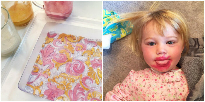 On the left is a sparkly melt and pour project that will be on the blog later this week. It is made in the new Tray Floral Wallpaper Mold. On the right, Lily got into my lipstick and proceeded to apply it to her lips and face. Such a mischievous one!