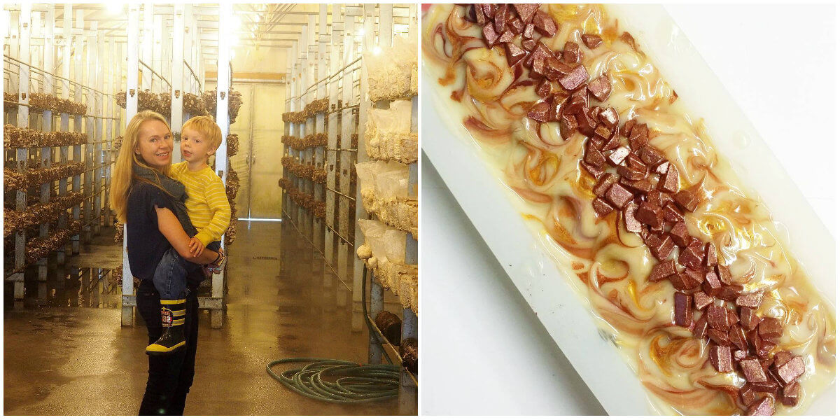 Last weekend, I the family and I visited a mushroom farm. It was so interesting to see how they are grown! We’re going to try our hand at growing some ourselves. On the right is a sparkly cold process project, with lots of mica painting and mica covered embeds. Click here to learn more about mica painting.