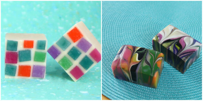 Below, left to right: Stained Glass Cold Process, 12 Color Linear Swirl Cold Process