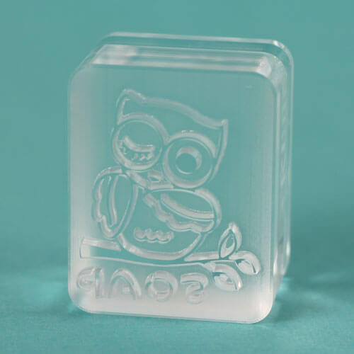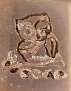 Below is one of our “fails” (and why we test all of our products for our customers). This is what the soap stamp looks like if the soap is too hard. The cute owl has seen better days!