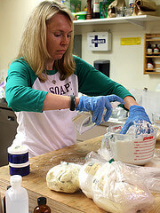 After a break for lunch (our traditional Farmer’s Market tour was rained out, boo!) it was time for a hands-on CP session. Each of the students got to make their own mini-loaf of soap, and there was an experienced Cold Process soap maker available for every 3-4 students to assist and answer questions.