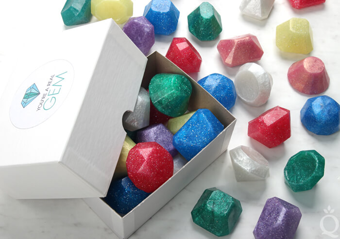 These soaps are the perfect DIY gift. They couldn’t be easier to make – all you need to do is mix Clear Melt and Pour Soap Base with Fine Silver Rainbow EcoGlitterJade Fragrance Oil, and any colors you like. The Silicone Gemstone Mold creates adorable bars that you can package in a box and finish with the free “You’re a Real Gem” label template.