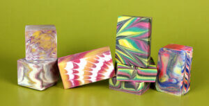 As we are gearing up for our annual Soap Weekend Intensive (a weekend filled with soap and toiletry making classes in Bellingham, Washington – and we just had a cancellation so last I heard, we had one last opening), we are thinking about what we want to teach next year. This year, we are teaching CP soap with milk, emulsified scrubs, 80’s inspired melt & pour soap, swirling cold process soap, and lotionmaking. Above are some examples of the CP soap the soapy team will be teaching in classes.